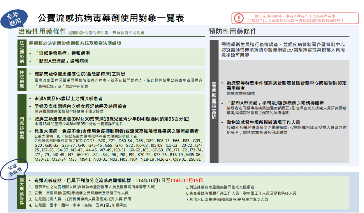 疾病管制署今(10/28)日表示,依流感監測資料顯示,目前國內流感疫情仍處於流行期,因此,疾管署延長擴大公費流感抗病毒藥劑使用條件「有類流感症狀,且具下列身分之流感高傳播族群」之適用期限至114年11月15日止,以維護民眾健康。