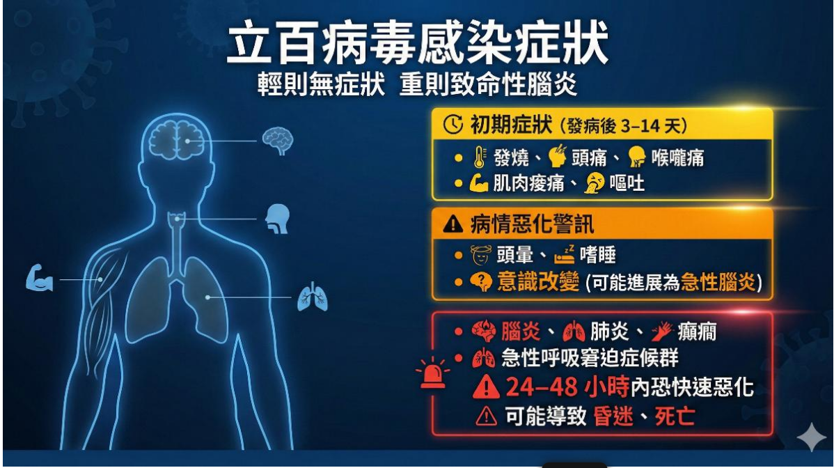 疾管署說明,立百病毒感染症為人畜共通傳染病,其自然宿主為果蝠(狐蝠屬),並可感染豬隻等中間宿主,再傳染給人類。傳播途徑主要分為動物傳人、食物傳播以及有限的人傳人三類,包含直接接觸病豬、食用受果蝠(狐蝠屬)尿液或唾液污染的食品等,或經由密切接觸病人的血液、體液、呼吸道分泌物造成感染。臨床症狀表現廣泛,包括無症狀感染、急性呼吸道症狀到致命性腦炎均可能發生。