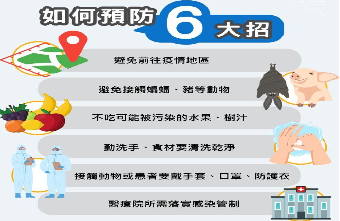 疾管署提醒,為減少受感染的風險,建議民眾避免前往立百病毒流行地區,如前往流行疫情區域,應維持良好個人衛生,避免接觸蝙蝠與豬隻,或接觸可能被蝙蝠污染的環境與物品,並應避免飲用生椰棗樹汁及食用受污染水果。相關資訊可至疾管署全球資訊網「立百病毒感染症」專區( https://gov.tw/BF4)或撥打國內免付費防疫專線1922(或0800-001922)洽詢。