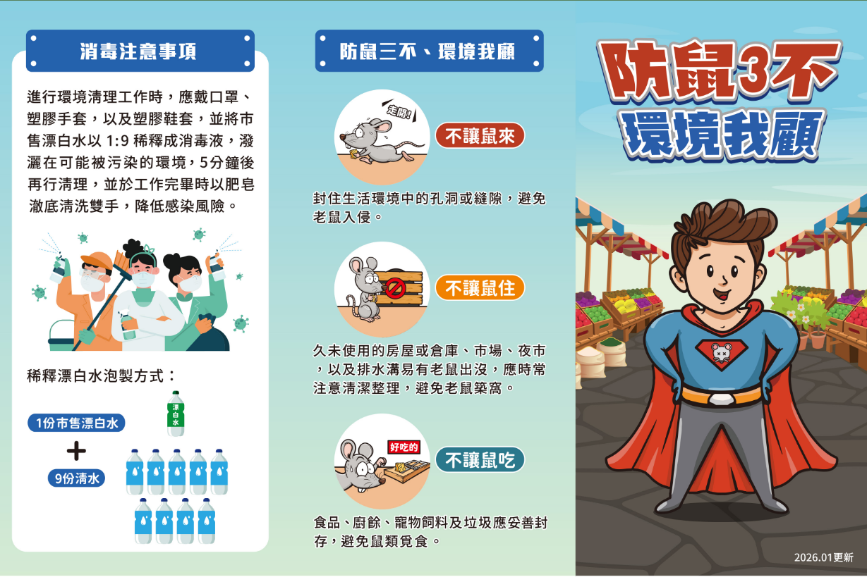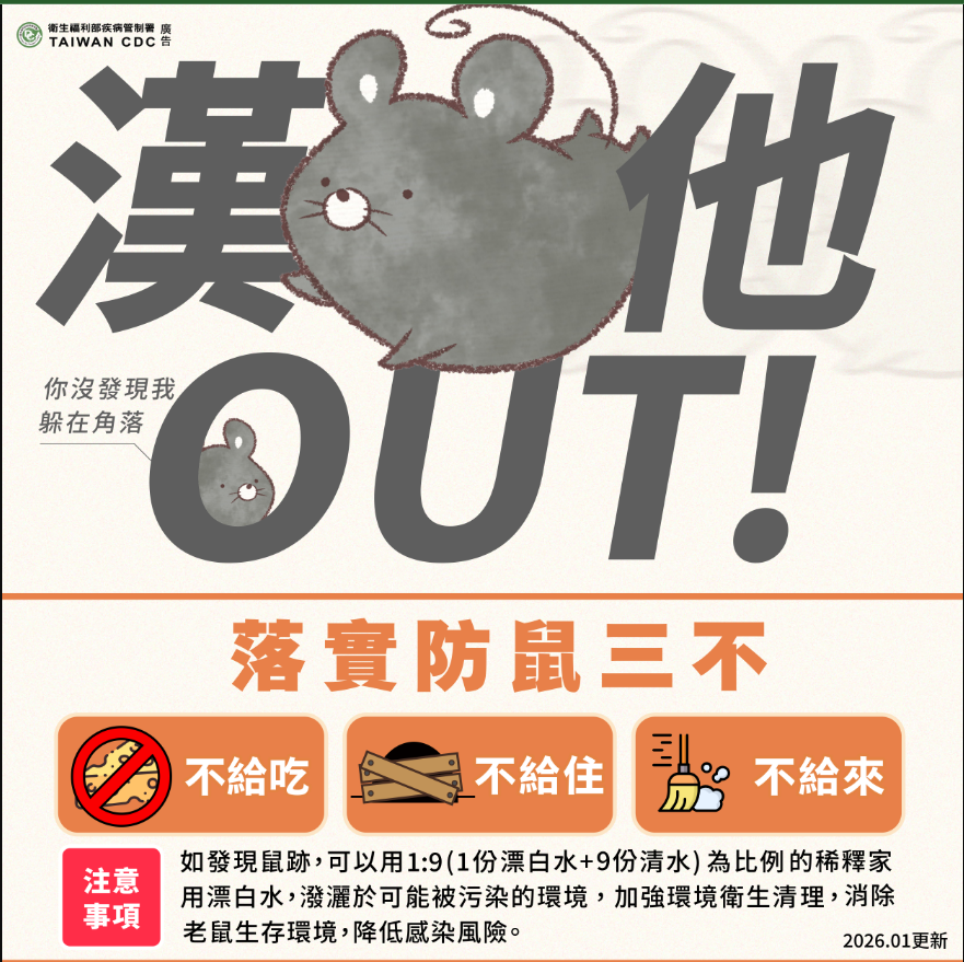 疾管署呼籲,落實「不讓鼠來、不讓鼠住、不讓鼠吃」是預防漢他病毒最有效的方法,民眾平時應留意環境中老鼠可能入侵的路徑,家中廚餘或動物飼料應妥善處理,並隨時做好環境清理,防火巷、排水設施(下水道、水溝蓋)、雜物堆、牆垣為鼠類族群活動熱區,請針對該等特定環境加強捕鼠與滅鼠工作。如發現鼠類排泄物時,應先佩戴口罩、橡膠手套及打開門窗,並以稀釋漂白水(100cc市售漂白水+1公升清水)潑灑於可能被污染的環境,待消毒作用30分鐘後再行清理。另為避免病毒飛揚於空氣造成傳播,請使用清除污物之拋棄式紙巾、抹布或舊報紙清理,再以垃圾袋密封後丟棄。相關資訊請至疾管署全球資訊網(https://www.cdc.gov.tw)或撥打免付費防疫專線1922(或0800-001922)洽詢。