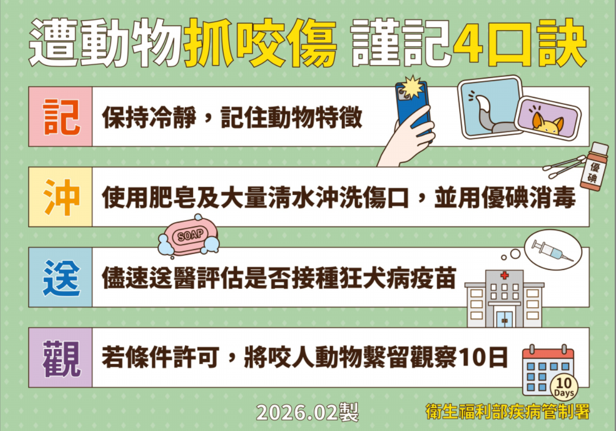 疾管署及防檢署呼籲,民眾於郊外活動時,應避免接觸、逗弄及捕捉野生動物,以避免暴露於狂犬病的感染風險。如不慎遭野生動物抓咬傷,請以肥皂及大量流動清水沖洗傷口至少15分鐘,再以優碘或70%酒精消毒後,儘速前往「人用狂犬病疫苗接種服務醫院(衛生所)」就醫;經醫師評估如有感染狂犬病風險,應儘速接種免疫球蛋白,並依時程(第0、3、7、14天,傷口暴露後接種第1劑當天為第0天)接種4劑人用狂犬病疫苗,以降低發病風險。
