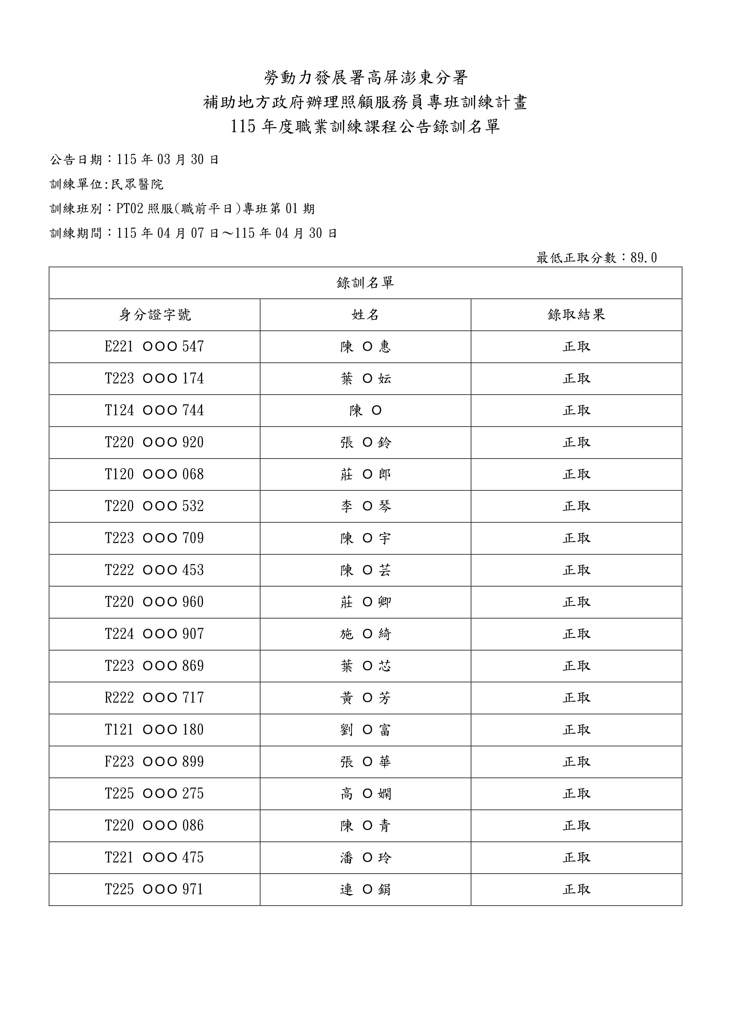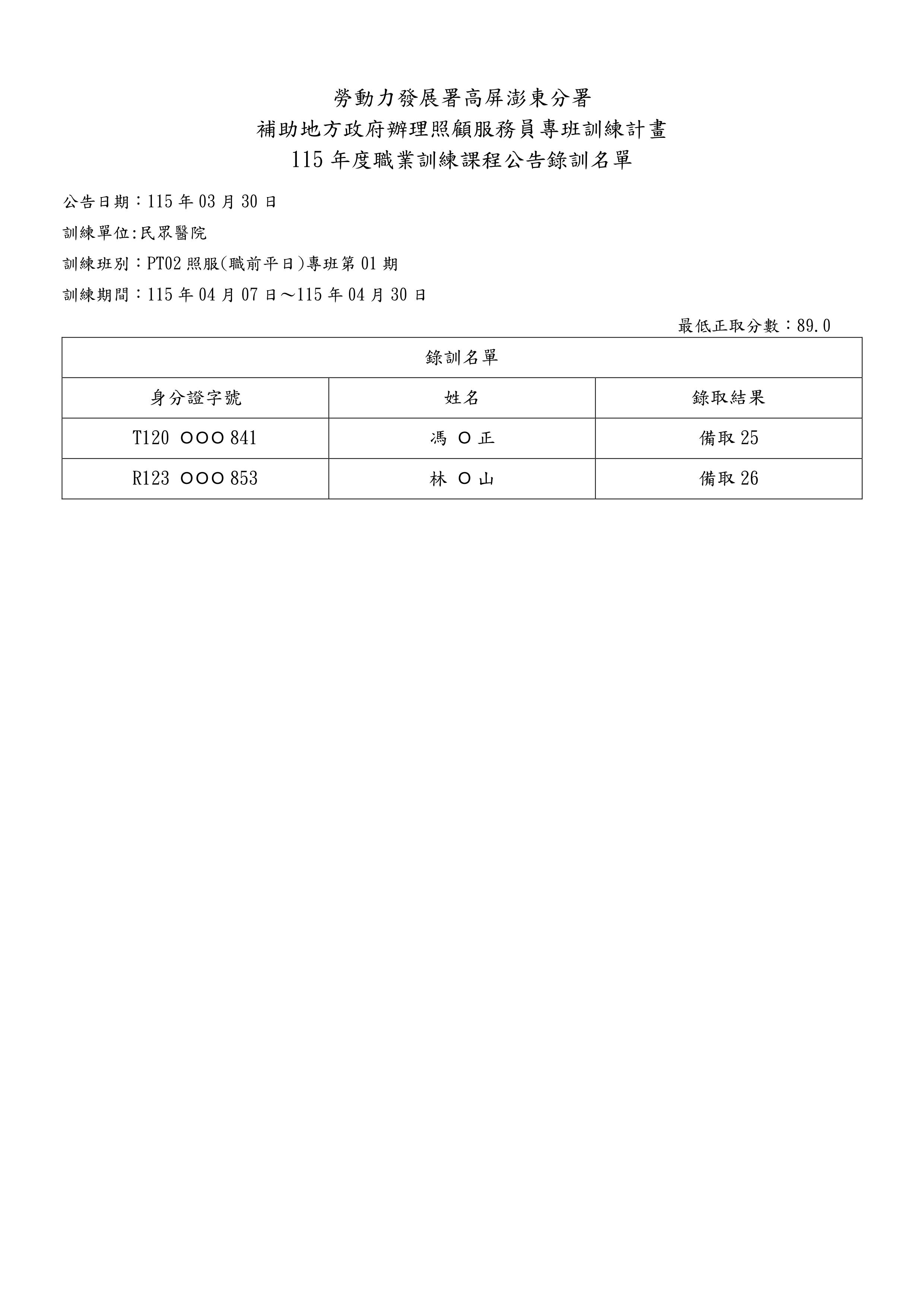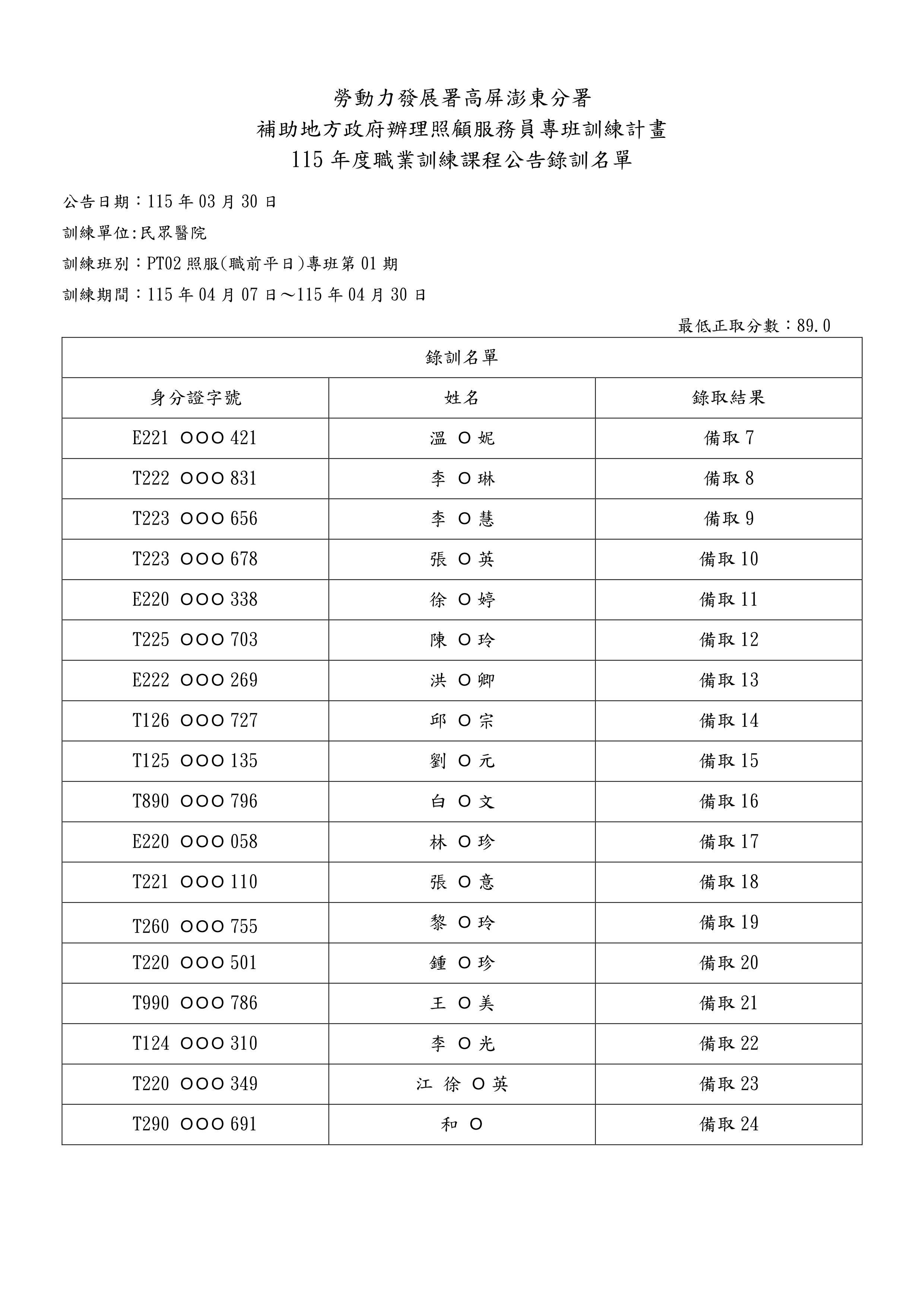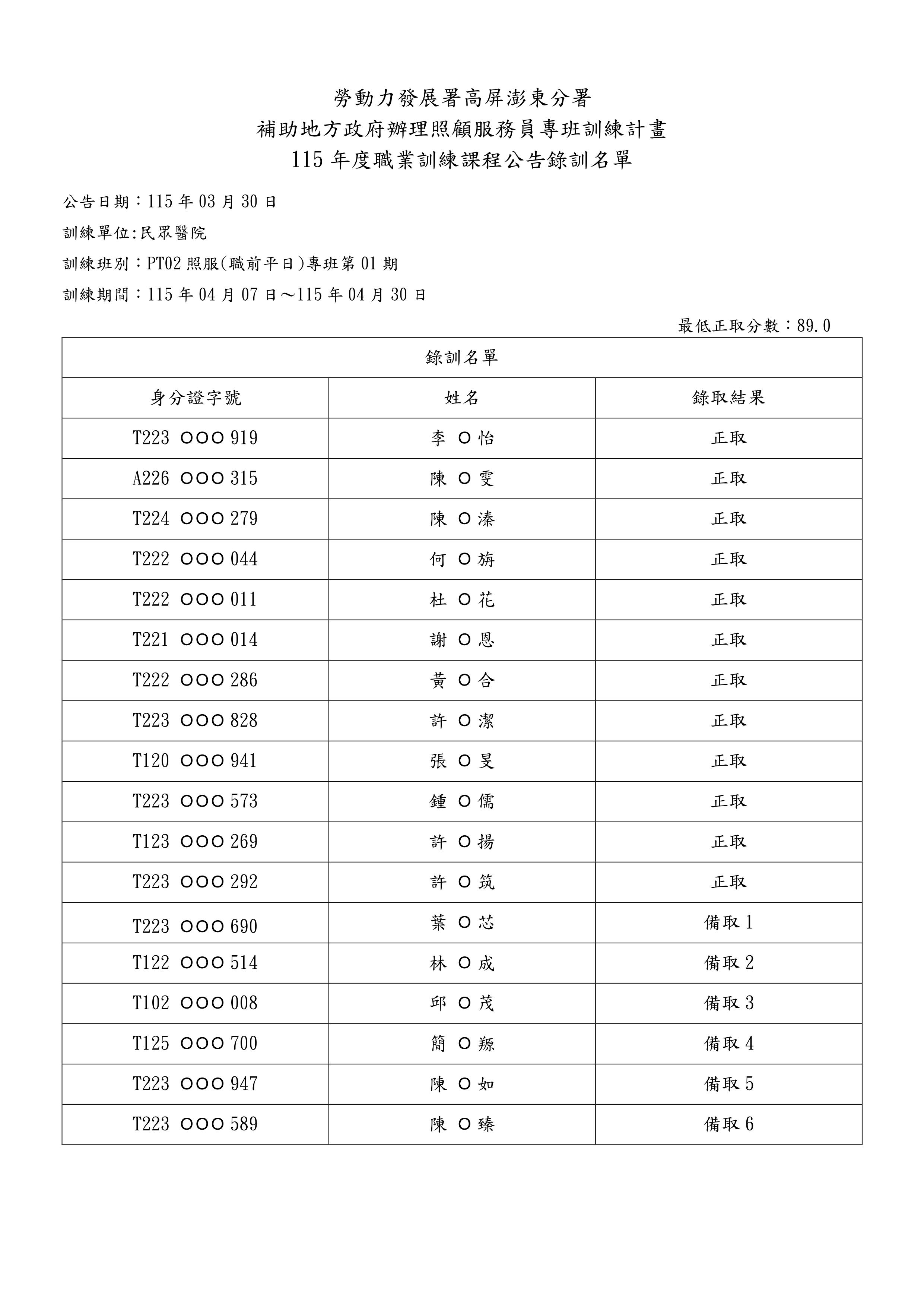 部立屏東醫院、寶建醫院、屏東基督教醫院皆可體檢,體檢報告麻煩最慢4/10以前繳交給辦訓單位,報告可 以請體檢單位直接郵寄到民眾醫院護理部收(地址:屏東市忠孝路120之1號 6樓)